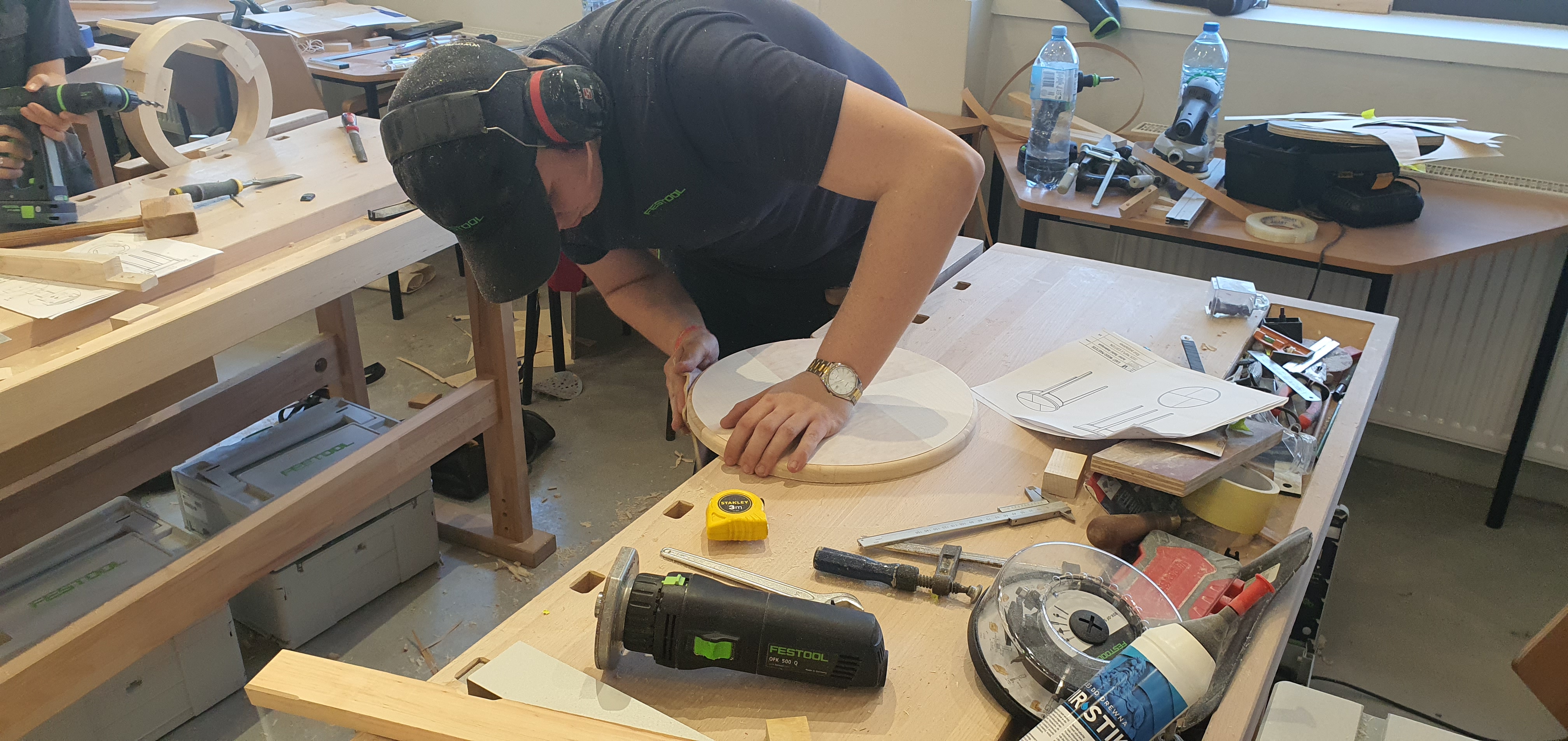 Przygotowana przez organizatora okrągła oskrzynia wymagała osadzenia trzech nóg skośnych. Uczestnicy musieli więc wykazać się umiejętnością posługiwania się zarówno piłami, jak i dłutami. Blat wymagał dokładnego docięcia elementów sześcioboku foremnego, sklejenia w całość, a następnie precyzyjnego cięcia i pasowania okleiny naturalnej, która następnie była naklejona w prasie hydraulicznej. Nie obyło się bez użycia elektronarzędzi – wiertarko‑wkrętarki akumulatorowej, pilarki uciosowej, frezarki górnowrzecionowej z zestawem frezów ścinowych i profilowych, a także szlifierki mimośrodowej – opisuje Łukasz Lipski.